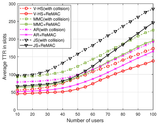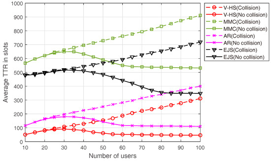 Figure 15 depicts a comparison of the performance with the number of users in the asymmetric model. We have omitted the symmetric model here because its results are obvious from the results of the asymmetric model. In this case, all the schemes demonstrate a stable behavior with the increasing number of users when there is no collision. MMC, EJS, and AR are outperformed by V-HS because of the better hopping sequence, as analyzed earlier. However, with collision, the average TTR continues to grow linearly with the number of users, which specifies a major drawback of the hopping sequences in a real environment. Increasing the number of users means more users will hop on the same channel; however, under no collision, the trend is different than the time of collision, as the users will find each other on the same channel, but there is no probe request/response collision.