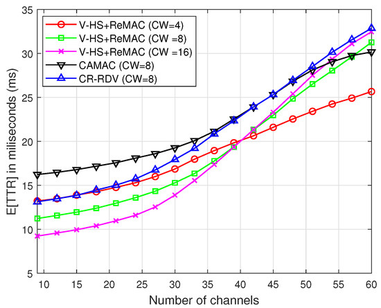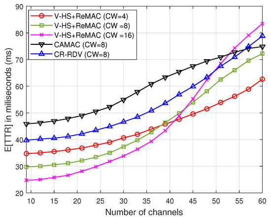 Next, the proposed ReMAC is integrated with the V-HS for both the symmetric and asymmetric models. To separate the effect of multiple rendezvous opportunities from ReMAC, we assume no retransmission in each slot; that is, if a collision occurs on the probe request or response, the user will hop to the next channel without retransmitting. Figure 16 and Figure 17 demonstrate a significant performance improvement by the integration of ReMAC and V-HS. The proposed ReMAC enhances a lower TTR compared to CAMAC and CR-RDV. CAMAC requires time synchronization before the rendezvous process, which leads to a higher TTR. In the case of CR-RDV, there is no process to reduce the overhead of RTS/RTS and CTS/CTS collisions. Therefore, some slots are wasted although the users are on the same channel. In ReMAC, users attempt to send at least one probe request before the next hop. The increase in the number of channels causes the SUs to be more distributed among channels. In both symmetric and asymmetric models, the TTR of is better when the channel number is low. With a higher , the probability of collision is reduced. However, when the channel number increases, the TTR naturally increases, as shown in Figure 13 and Figure 14. In ReMAC, more channels have a better performance with . Both these figures verify that MAC has a strong impact on the TTR performance.