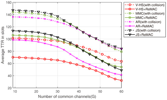 One of the major advantages of ReMAC is its interoperability. ReMAC works with any channel-hopping algorithm. Figure 20 presents the performance of ReMAC with MMC, EJS, AR, and the proposed V-HS. To signify the performance of ReMAC, we also present the TTR performance of all these CH sequences considering collision. With the increasing number of G, all the schemes achieve rendezvous at a lower TTR; however, this can be significantly reduced by ReMAC. In ReMAC, whenever a collision occurs, the user assumes that some users are trying to communicate on the channel. Therefore, the user modifies its backoff time and attempts to rendezvous again on the current channel. The simulation results presented in Figure 21 depict the average TTR for different CH schemes with respect to the increasing number of users. The average TTR increases with the increase in the number of users because it causes more collisions during rendezvous attempts. As explained earlier, ReMAC attempts to rendezvous on the channel based on .