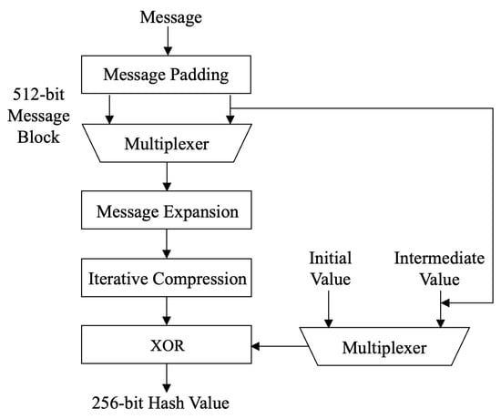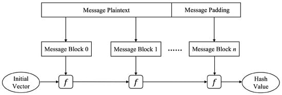 At present, the iterative structure of hash function can be mainly divided into two types: Merkle–Damgård structure and sponge structure. The Merkle–Damgård structure [] has a suitable property; if its compression function is collision resistant, then the hash function with this structure is also collision resistant. Early hash functions such as MD5, SHA-1, and SHA256 adopted this design. The Merkle–Damgård structure is shown in Figure 1.