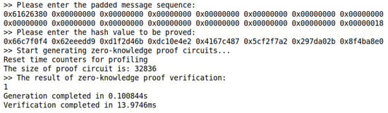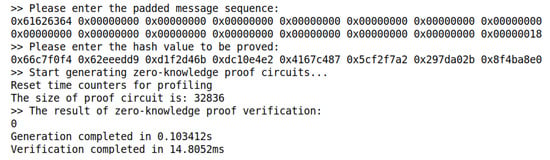 Zero-knowledge proof is an efficient protocol based on probabilistic verification, which enables the prover to prove to the verifier that the prover knows a secret value without revealing any information about the value. As early as 1987, it was proved that any NP (non-deterministic polynomial) problem has a zero-knowledge proof []. The general solution for converting NP problems into zero-knowledge proofs is to split the problem into an intermediate form expressed by arithmetic gates or logic gates as the basic operation, and then extract the intermediate form into a circuit description matrix; finally, the proof is generated based on the back-end program of a specific zero-knowledge proof protocol.
