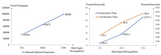 The Performance of circuit size, generation time and verification time under different sizes of hash input messages in tests.
