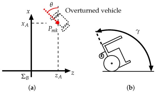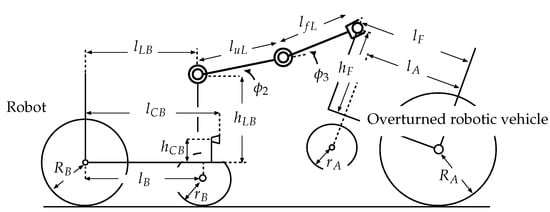 We assumed that the robot had already determined the correct position to grasp the vehicle in order to achieve successful recovery ( mm, mm). We also assumed that the driving wheels of the robot and vehicle would not slip, and that the robot could generate sufficient force to pull and support the overturned vehicle during the recovery process.