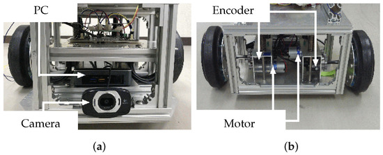 This robot has two pairs of left and right wheels mounted in tandem. The front pair are casters, and the rear pair are individually mounted driving wheels. The robot has motors and encoders on both driving wheel mechanisms that control its movements, as shown in Figure 4.