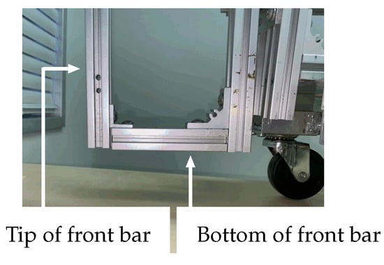 When the robot approaches the overturned robotic vehicle, the manipulator grasps the front bar of the vehicle (Figure 5), using its hand mechanism (Figure 2 and Figure 3a) and attempts to help restore the overturned vehicle to its correct working position. Table A2 in the Appendix A lists the specifications of the overturned robotic vehicle, which is referred to as the “vehicle” hereafter in this paper (Figure 6). Like the recovery robot, the vehicle also has a wheeled mechanism that consists of front and rear wheel pairs. The front pair are casters, and the rear pair are individually mounted driving wheels.