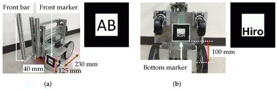 In this study, AR markers are mounted on the front (Figure 6a, Size: 70 mm × 70 mm) and bottom (Figure 6b, Size: 80 mm × 80 mm) of the overturned vehicle. The robot is able to obtain posture and distance information from the overturned vehicle based on data from these AR markers.