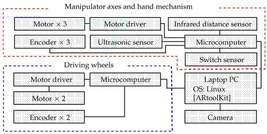 The robot is equipped with microcomputers (Arduino Holding, Arduino Leonardo) connected to the PC via Universal Serial Bus (USB) cables and connectors. Three motor driver circuits (Cytron Co., Ltd., MD10C) are connected to each microcomputer to control the driving processes. Electric motors (driving wheels: Tsukasa Electric Co., Ltd., TG-85E-SU-114-KA; shoulder and elbow axles: Tsukasa Electric Co., Ltd., TG-85E-KU-113-KA; and hand: HG16-240-AB-00) are connected to the motor driver circuits. Rotary encoders permit the degrees of these motors to be determined (driving wheels: Autonics, E30S4-100-3-N-5, shoulder axle, elbow axle, and hand mechanism: Taiwan Alpha Electronic, RE640F-40E3-20A-24P).