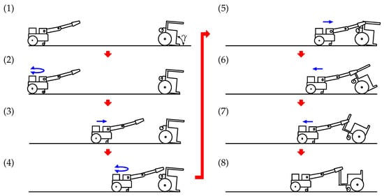 - Ikeda, H.; Kawabe, T.; Wada, R.; Sato, K. Step-Climbing Tactics Using a Mobile Robot Pushing a Hand Cart. Appl. Sci. 2018, 8, 2114. [Google Scholar] [CrossRef]