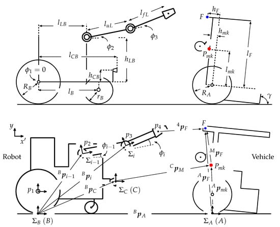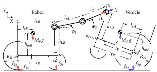 where is a variable that depends on the inclination of the vehicle. In this case, the reaction force exerted by the connected vehicle (or robot), , is expressed by the following Equation (13).
