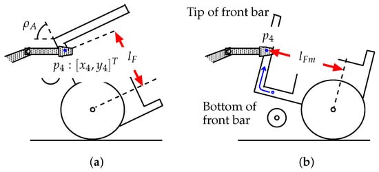 Connecting position and inclination of the vehicle: (a) situation where the hand is lower than the tip of the front bar (); (b) situation where the hand is higher than the tip of the front bar ().