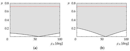 The shaded area in Figure 11a shows the relationship between the inclination of the overturned vehicle and the coefficient of friction between the robot rear wheels and the road surface required to avoid slippage of the robot driving wheels (). Similarly, the shaded area in Figure 11b shows the relationship between the inclination of the vehicle and the coefficient of friction that ensures no slippage of the vehicle wheels (). The lowest points in Figure 11a,b occur at , when the horizontal position of the center of gravity of the vehicle is above the contact position of the rear wheels (Figure 12).