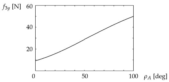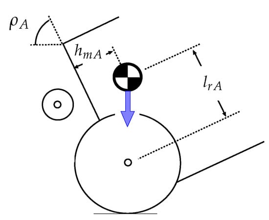 When the hand position becomes higher than the vehicle’s front bar (, thus 0 ≤ 49.74°), Figure 10b), the hand grasps the tip of the front bar. The equilibrium vehicle moment about the point of contact between the rear wheels and the ground is then given below.
