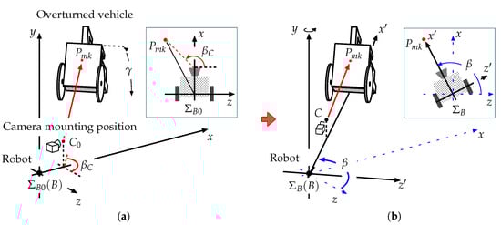 When the robot turns toward the vehicle, , x, and z change to , , and , respectively (see Figure 14b). The camera position on the robot, , changes to C.