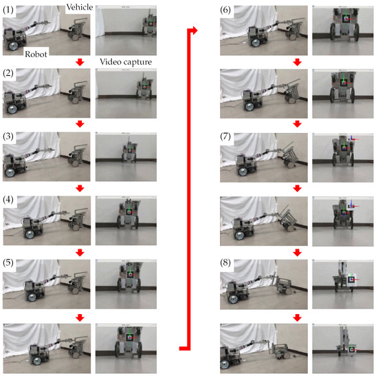 The states shown in Figure 17 correspond to (1)–(8) described earlier. The left panels show movements of the robot and vehicle, and the right panels show video images captured by the camera mounted on the robot. The arrows on the right side indicate that ARtoolkit was able to detect the AR markers.