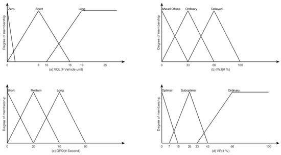 The GPD is the duration of the green phase of the traffic light. It contains three membership functions named Short, Medium and Long that range from 0 to 60 s, as illustrated in Figure 2c.