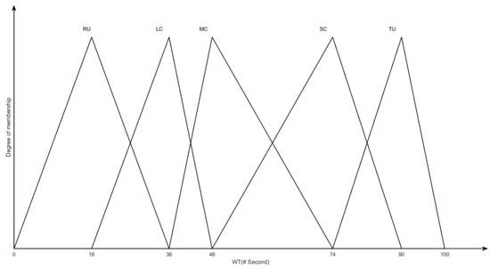 The output of the fuzzy logic system WT (the waiting time of a vehicle unit) is used to identify the delay caused by traffic congestion. It contains five membership functions called RU (Road Unobstructed), LC (Light Congestion), MC (Moderate Congestion), SC (Severe Congestion), TU (Traffic Tie-Up) that range from 0 to 100s, as illustrated in Figure 3. The proposed fuzzy logic system comprises forty-five fuzzy rules. Some of these rules are shown in Table 1, below.