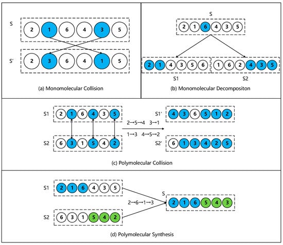 When the solution space satisfies the condition of Intergroup-Collision, will occur. As shown in Figure 4c, the solution space is slightly changed. In the , we use Conflict-Detection to map the conflicting values so as to ensure the non-repeatability of the arrangement between S1′ and S2′. In the example of Conflict-Detection in Figure 4c, we can see two sets of mappings and . Thus, if there are two s in the solution space after the , will be converted to , and so on, until there is no conflict. After the Collision, the KE between the solution spaces is redistributed and the PE of the solution spaces is updated. When the solution space satisfies the condition of Intergroup-Synthesis, will occur. As shown in Figure 4d, the solution space is changed considerably. Choose a synthesis point for the two solution spaces. Then, the of S1 and the of S2 are combined to produce a new solution space S with great diversity. In the , we also use Conflict-Detection to map the conflicting values so as to ensure the non-repeatability of the arrangement of S. After the synthesis, the KE of the solution spaces is aggregated, and the PE of the solution space is updated.
