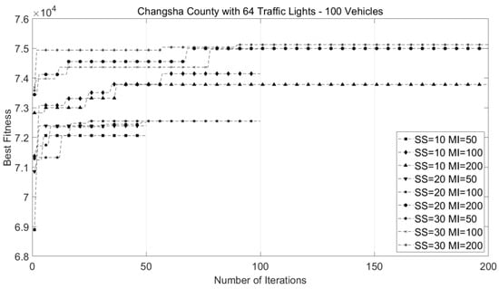 The swarm intelligence algorithm [28] has also been studied in the context of solving the multi-dimensional nonlinear programming problem of traffic signal control. Ceylan [29] realized traffic signal timing optimization of balanced networks through genetic algorithms, thus improving computational efficiency and performance. Jose [30] optimized the traffic signal regulation of a large heterogeneous urban road network through a particle swarm optimization algorithm which reflected the potential effect of swarm intelligence algorithms in addressing such problems. Nasser [31] introduced an index scheme to control the iteration time of local optimization, thus accelerating the convergence speed of traffic signal timing strategy. Aleksandar [32] optimized the traffic control system of a large area in regional cities through the cluster principle of a bee colony collecting honey, thus improving the control range of a swarm intelligence algorithm for an urban road network. However, the swarm intelligence algorithm is still unable to cope with large-scale urban road network structures and the continuous complexity of traffic conditions. Moreover, how to construct a cooperative optimization framework to adapt to large-scale transportation network optimization is a problem that also needs further study.