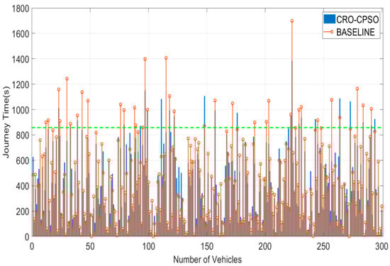Considering information on various events during the simulation, the fitness function of CRO-CPSO is shown as Equation (5). Equations (8)–(10) are the constraints on it. The main objective of Equation (5) is to enhance the driver’s driving experience and reduce driving time. We achieve the incentive effect by increasing the number of vehicles that arrive at the destination within the reward time and giving the reward score . We set the decision factor for the reward score () so that the vehicle that runs out of time will not receive . Equation (8) ensures that each vehicle unit only passes through any intersection at most once. Equation (9) ensures that vehicle units with higher priority pass first while waiting at the intersection. Equation (10) ensures that only one traffic light is green at each intersection at any given time.