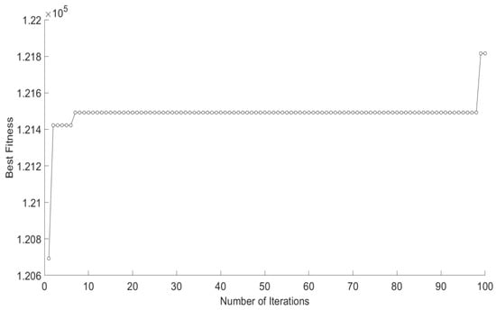We introduce the idea of particle swarm optimization in the iteration of . Each potential solution to the problem is the position of the particle, and the particles are updated iteratively on a population scale. The particles are initialized before the iteration begins. The fitness of the particles is calculated using Equation (5) as the initial and of the particles. Then, the circular heuristic search process is initiated: and ( for the particle is rounded in the updating process) for the particle are updated iteratively, and its fitness is calculated. If the fitness is better than , update . If the fitness is better than , update . In each iteration update, the particle updates its position according to Equation (18):
