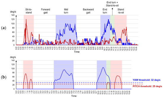 Example of identification of the TUG test sub-tasks (red line: PITCH signal; blue line: YAW signal): (a) rectification for raw data; (b) results of the TUG test data pre-processing for recognizing the TUG test sub-tasks.