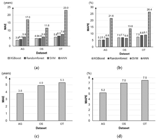 Performance comparison of the regression models: (a) MAE comparison results between four algorithms; (b) MAPE comparison results between four algorithms; (c) MAE results of XGBoost models to each datasets; (d) MAPE results of XGBoost models to each datasets.