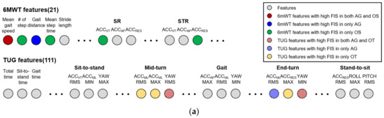 Additionally, the average gait speed and the total gait distance exhibited a high FIS in the model incorporating both the TUG test and 6MWT features. This is presumed to be because the two features are the most commonly used ones in the assessment of the gait ability in the elderly in clinical studies applying the 6MWT.