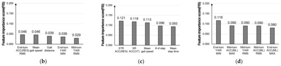 The top five most important features in the generation of each regression model are presented in Figure 6. Figure 6a shows the top five most important features among the 6MWT and TUG test features. For the 6MWT features, the average gait speed showed a high FIS in both AG and OS models, while the gait distance showed a high FIS in AG only, and the number of steps, mean step time, SR of ACCVT and STR of ACCRES showed a high FIS in OS only. For the TUG features, the features related to the turn activity showed a high FIS. To be specific, the RMS of YAW for end-turn and the minimum of YAW for end-turn showed a high FIS in both AG and OT; the RMS of ACCML for end-turn showed a high FIS in AG only; the RMS of ACCML for mid-turn, the maximum of ACCML for mid-turn and the maximum of ACCML for end-turn showed a high FIS in OT only. Figure 6b–d show the FIS of the top five most important features in the model generation. First, the AG showed a high FIS for the ACCRES RMS for the end-turn (0.046), the average gait speed (0.046), total gait distance (0.039), the minimum YAW for the end-turn (0.036), and YAW RMS for the mid-turn (Figure 6b); the OS showed a high FIS for the STR (0.121) of ACCRES, the SR (0.118) of ACCVT, the average gait speed (0.113), the number of step (0.096) and the average step time (0.093) (Figure 6c); the OT showed a high FIS for the minimum YAW for the end-turn (0.116), the maximum ACCML for the mid-turn (0.090), the YAW RMS for the mid-turn (0.090) and the ACCML RMS for the mid-turn (0.090), and the maximum ACCML for the end-turn (0.080) (Figure 6d).