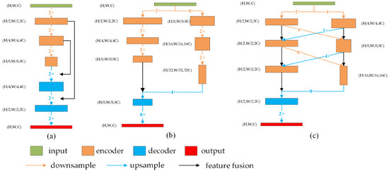 Different semantic segmentation network structures. We adopt direct addition as the feature fusion. (a) Typical U-shaped encoder–decoder structure represented by U-net [36]; (b) bilateral network structure represented by BiSeNet; (c) multi-resolution parallel network architecture represented by HRNet [37].