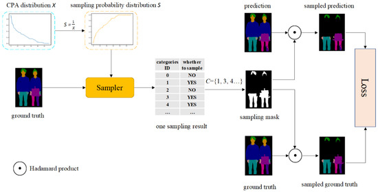 The structure of PRA is shown in Figure 4. The sampling probability of each category is obtained by calculating the CPA distribution of each category and Equation (3). The sampler samples the pixels in the image according to the sampling probability distribution of different categories. The categories sampled by the sampler in each ground truth are recorded, and we use these records to generate category set C to generate the sampling mask for this sampling process. In fact, the same ground truth may have different sampling mask in different batches. However, with the increase in batches, the sampling times of each category tend to the corresponding sampling probability. The definition of sampling mask is as follows: