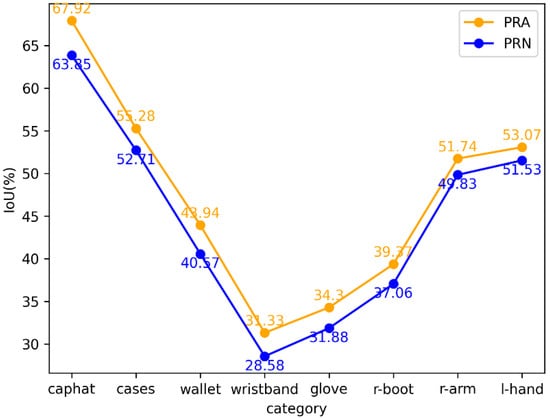 It can be seen from Figure 5 several categories in which PRA is more improved than PRN, all have the characteristics of being difficult to classify, such as caphat, cases, wallet, wristband, and glove, which have many styles and small volumes, and the right-boot, right arm, and right hand have symmetry and are easily confused with the corresponding mirror categories. For the head categories with a large number of samples, PRN selects undersampling according to the number of samples. It can be seen from Figure 3a that the CPA of these difficult-to-classify head categories are at a very low level in the early stage of training, so PRA oversamples these categories, allowing the model to use more samples to learn more robust features.