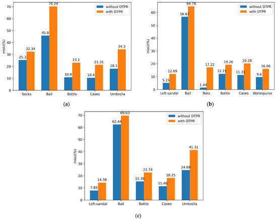 The mIoU performance with different models on some categories. (a) PSPNet is used as the semantic segmentation model. (b) Deeplab3+ is used as the semantic segmentation model. (c) DANet is used as the semantic segmentation model.