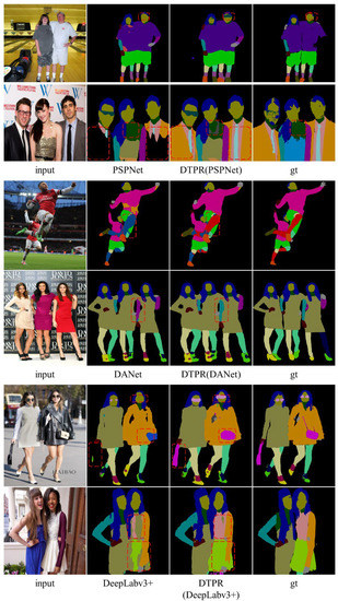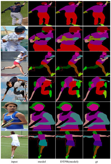 Six representative images chosen from the LIP validation dataset are shown in Figure 8. The first two lines show that the model trained by DTPR can recognize the tail category more precisely, such as the gloves in the picture. In addition, the DTPR-trained model achieves better parsing results than the original model in both mirror categories (left and right arms, left and right shoes) and hard-to-classify samples (shorts and skirts).