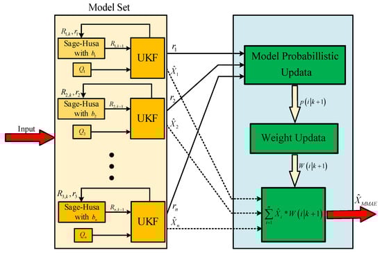 Therefore, in order to solve the problem of estimation accuracy degradation caused by improper noise parameter setting and limited coverage of the classical MMAE model, aiming to enhance the adaptability of the system to time-varying noise and the ability to deal with nonlinear systems, we proposed an improved structure of the MMAE, which combined Sage–Husa with MMAE. Specifically, we replace the standard Kalman filter of the classical MMAE with the Sage–Husa adaptive UKF. This variable-parameter multi-model structure reduces the system’s dependence on the selection of initial noise parameters and extends the coverage of the MMAE model.