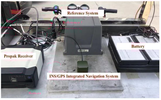 In this section, we applied the algorithm to INS/GPS vehicle integrated navigation and carried out three experiments. Experiment 1 is used to verify the effect of the forgetting factor on estimation accuracy under different system states. Experiment 2 is designed to test the effectiveness of the improved hypothesis testing algorithm of MMAE for mitigating competition of undesirable models. Experiment 3 by comparing the positioning accuracy of different algorithms to test the effectiveness and meliority of the proposed method. A vehicle navigation platform, as shown in Figure 3, is used to collect INS and GPS navigation data. The INS is composed of three sets of MEMS accelerometers and gyroscopes; NEO-M8T was used as the GPS receiver. A high-precision navigation device was installed on the vehicle navigation platform to collect accurate navigation data as the reference. These instruments have been carefully calibrated and compensated for the lever arm error. The parameters of the above navigation device are shown in Table 1.