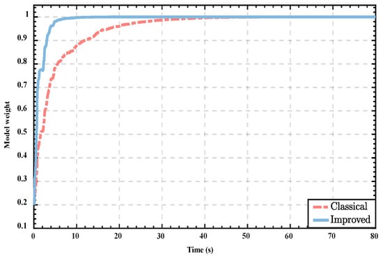 According to the result of Figure 4, it can be noticed that the optimal model of the classical MMAE suffers from the competition from undesirable models, and the convergence rate of the optimal model is slow. In contrast, the convergence rate of the improved algorithm is significantly greater than the classical algorithm. From the results, the improved method significantly alleviates the undesirable competition and reduces the algorithm’s identification time, which can dramatically improve the performance of the variable-parameter MMAE in the time-varying noise environment.
