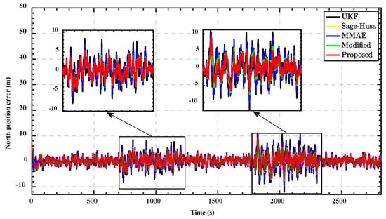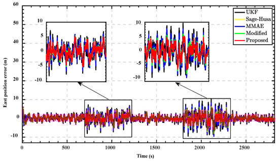 Subsequently, we used different integrated navigation algorithms to solve the data and compare the results with the navigation results of the reference device to obtain the position errors. The position errors in the east direction for different algorithms are demonstrated in Figure 5, and the north position errors are shown in Figure 6. In order to quantitatively evaluate the performance of different algorithms, the MSE of the position error in three observation intervals are shown in Table 4.