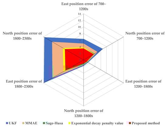 In order to show the performance difference between the five algorithms more intuitively, the radar chart for MSE of position error as shown in Table 4 is demonstrated in Figure 7. It can be seen from Figure 7 that the performance of the proposed method is significantly superior to other methods.
