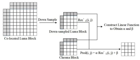 Linear prediction assumes a linear relationship between reference samples and the samples to be predicted. The final prediction value is obtained by constructing a linear function. Typically, CCLM linearly obtains the chroma prediction value through the corresponding reconstructed luminance samples. The process of CCLM is shown in Figure 1. First, the co-located luminance block is down-sampled. Then, the reference pixels of the current chroma block and the down-sampled luminance block are used to calculate the parameters by constructing a linear function. Finally, the chroma prediction value is obtained by a linear function.