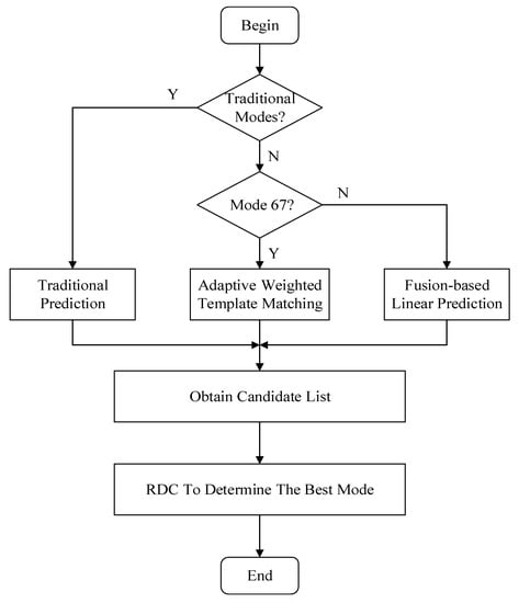 As mentioned previously, our proposed fusion-based algorithm includes two parts: fusion-based adaptive template matching (mode 67) and fusion-based linear prediction (mode 68). The overall flowchart is depicted in Figure 2. We termed the VVC’s original intra prediction modes (mode 0~mode 66) as the traditional/original modes. When conducting intra prediction, we have to first decide on whether the prediction mode is traditional. If the mode is traditional, the original mode of the VVC is utilized to obtain the prediction pixels. If the mode is not traditional, we then decide on whether the mode is 67 or 68. If it is mode 67, the fusion-based adaptive template matching is employed. If it is mode 68, fusion-based linear intra prediction is used. Some modes can be selected with less distortion, called candidate modes, by rough calculation. Finally, the Rate–Distortion Cost (RDC) is utilized to determine the best mode from these candidate modes. Since the decoder can perform the same operations as the encoder to obtain the prediction and reconstructed values based on the mode number, we do not need to send extra flag bits.
