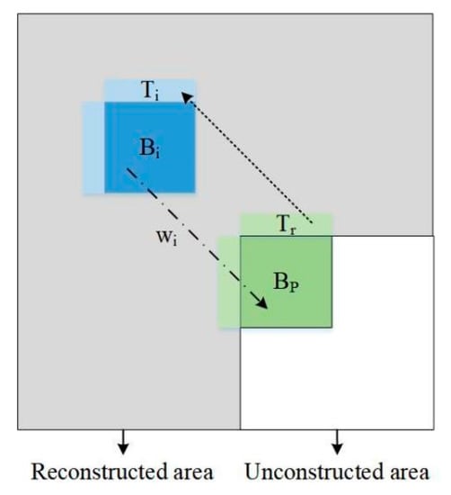 Usually, high correlation and similar textures are prevalent with blocks, and the TMP algorithm can find candidate blocks with the least errors in the reconstructed area to better predict the region with similar textures. Since it searches and compares pixel by pixel, it usually performs well for blocks with similar textures. The process of template matching is shown in Figure 3, in which is the reference template and is the candidate template. is the block to be predicted and is the corresponding prediction block of . is the corresponding weighting factor of the candidate block. First, we find the candidate blocks through in the reconstructed area, and then is utilized to obtain .