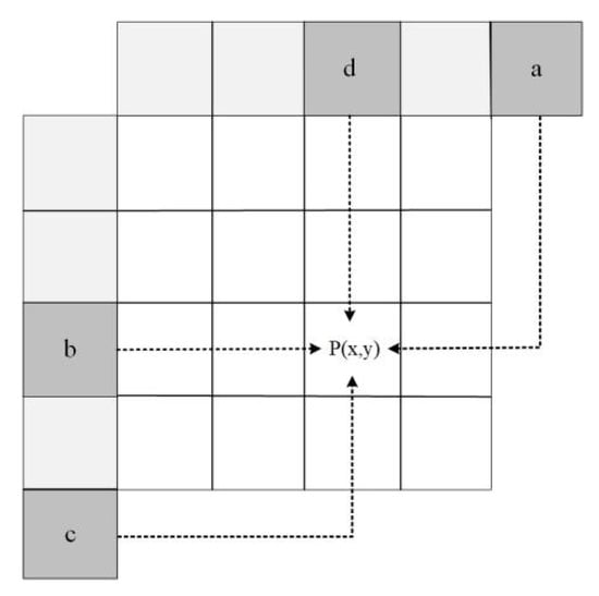 When the PU size is small, single three-parameter linear prediction can achieve good results. However, when the PU size is large, prediction accuracy declines with the weakening in correlation. Hence, we combined the three-parameter mode with planar mode to obtain the final prediction value. Planar mode obtains the prediction value by weighting the pixels in the horizontal and vertical directions, where the weights are related to the distance. The prediction process of the planar mode is shown in Figure 4.