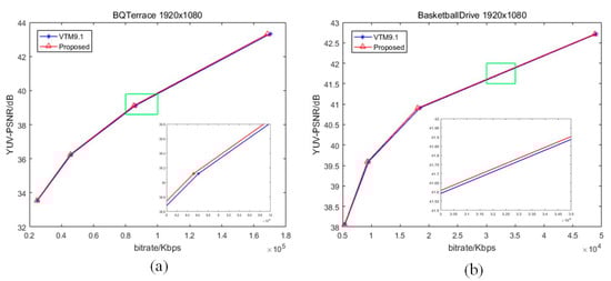 Figure 5, Figure 6 and Figure 7 illustrate the Rate–Distortion (RD) curves of some sequences in QP 22, 27, 32, 37. The horizontal axis is the bitrate and the vertical axis is the YUV-PSNR. If the curve of our proposed algorithm is above the VVC, this shows that the peak signal-to-noise ratio (PSNR) of our proposed algorithm is higher than that of VVC for the same bitrate, indicating that our proposed algorithm enhances the compression performance. Otherwise, our proposed algorithm deteriorated the performance. In Figure 6, the blue curve is VTM9.1, and the red one is proposed. We enlarged a small part (the position of the green rectangle) of each curve to show the comparison of results more intuitively. Clearly, our RD curves were higher than that of VVC. For areas with a similar texture, our proposed fusion-based algorithm could better model the relationship between the reference pixels and pixels to be predicted. Hence, for the same PSNR, our algorithm needs less bitrate, which means that our proposed algorithm improves the compression performance of VVC.