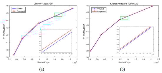 The RD curves of some sequences: (a) “Johnny” (1280 × 720); (b) “KristenAndSara” (1280 × 720).