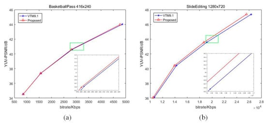 The RD curves of some sequences: (a) “BasketballPass” (416 × 240); (b) “SlideEditing” (1280 × 720).