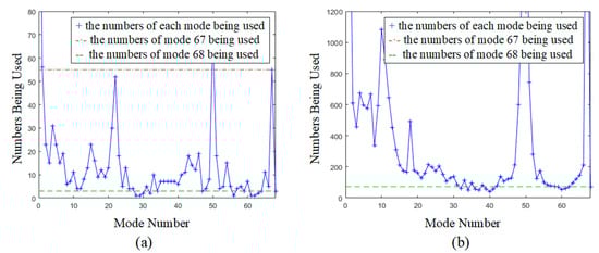 To show the using probability more intuitively, we plotted the numbers being used in all luma modes of the sequence “BasketballPass” (416 × 240) in QP 32 and “BQTerrace” (1920 × 1080) in QP 27, as shown in Figure 8. The X-axis is the mode number, and the Y-axis is the number being used for each mode. We drew two dotted lines with the numbers being used for mode 67 and mode 68, respectively, to show the comparison of the results more intuitively. Here, the red dotted line represents the numbers of mode 67 being used, and the green one represents the numbers of mode 68 being used. If the blue “+” is below the red dotted line, it means that the using numbers of this mode are less than that of mode 67. Correspondingly, if the blue “+” is below the green dotted line, it means that the numbers being used of this mode are less than that of mode 68. In Figure 8b, there is no red dotted line. This is because mode 67 had been used more than 1200 times and could not be explicitly shown in the figure. Clearly, the numbers being used for mode 67 were much higher than that of most VVC traditional modes. Although the using probability of mode 68 was only 0.29% (“BasketballPass” in QP 32) and 0.22% (“BQTerrace” in QP 22), the numbers being used for mode 68 were still higher than some of the original VVC intra prediction modes.