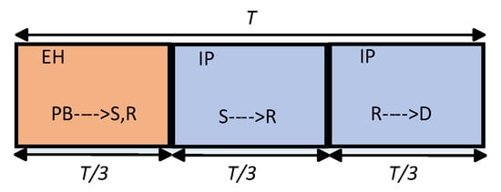 A typical RF EH process is achieved in a short range and a line of sight (LoS) exists between PB and the EH nodes. Inspired by this fact, we assume that the links between nodes in Figure 1 are exposed to mix-fading [30,46]. The proper fading channel model, including an LoS component, is considered as the Rician model. However, the cumulative distribution function (CDF) and probability distribution function (PDF) of the Rician distribution include special functions which make the analysis more complicated and the results are not mathematically tractable. On the other hand, the Nakagami-m fading model provides a good approximation of the Rician channel model [47,48,49]. Motivated by this, we assume that the links PB→S and PB→R are exposed to Nakagami-m fading, represented by channel coefficients and , with channel parameters and , respectively. Moreover, the links S→R and R→D are subject to Rayleigh fading, with gains and , respectively. It is assumed that the CSI is perfectly known at the receiving nodes, and the channels are assumed to be exposed to flat fading and remain fixed during a transmission interval and vary independently from one interval to another. The overall transmission time T is divided into three equal time slots, as shown in Figure 2. It should be noted that this assumption is considered in [2,4] where it provides a maximized system performance. In the first time slot of duration , PB broadcasts the dedicated energy bearing signal. In the second and third time slots, S and R transmit their signals to R and D, respectively. and denote additive white Gaussian noise (AWGN) samples which are independent and identically distributed (i.i.d.) complex Gaussian random variables (r.v) as . Finally, the notation and system parameters are listed in Table 1 and Table 2, respectively.