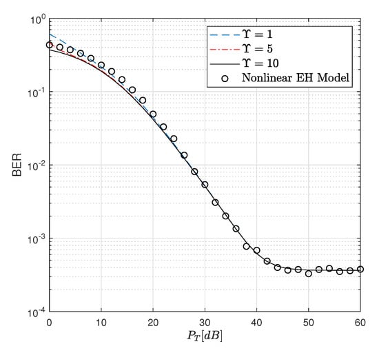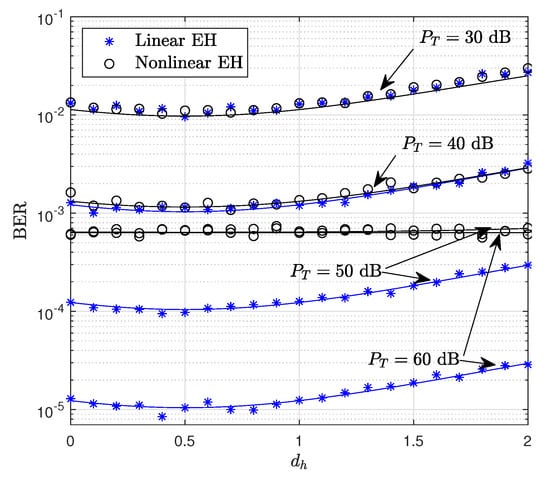 The BER performance of the proposed WP DH AF relaying system with respect to is presented in Figure 5. For values lower than 40 dB, the linear and non-linear models provide the same performance, while for higher than 40 dB, the BER performance for the non-linear EH model converges to the error floor, which verifies that the harvested power is higher than the threshold power. In other words, for higher SNR values, . It is seen from Figure 5 that the linear EH model overestimates the system performance compared to the realistic results obtained for the non-linear EH model. Moreover, considering the linear EH model, approximately, 2 dB, and 6 dB SNR losses are obtained for the BER of by increasing the value of from 1 to 2 and 3, respectively.
