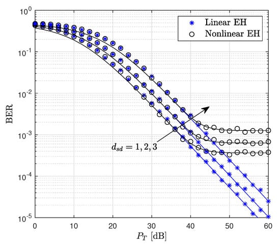 In this section, the simulation and theoretical results are presented for different system parameters, which provides a comprehensive insight into the analysis of the WP DH AF relaying system. In all figures, the simulation and theoretical curves are denoted by symbols and lines, respectively. The numerical results obtained from simulations and theoretical derivations are in perfect match with each other at high SNR values, which verifies our theoretical analysis. Moreover, throughout the paper, the integrals in (32), and (A21) are numerically calculated using MATLAB and Wolfram Mathematica Computer Software. Furthermore, the numerical results for the derived summations in analytical expressions are obtained for , which makes them sufficiently reliable. The BER results are provided with respect to various system parameters. The numerical results for BEP are obtained from (15) and (30) and for throughput by replacing (35) and (55) in (34), for the linear and non-linear EH models, respectively. Unless otherwise stated, we assume and . The path loss coefficient is taken as [57]. All channel gains and noise powers are fixed as and , respectively. Moreover, R is located at the middle of S and D, so that . It is assumed that S, R, and D are located co-linearly, and PB moves along a trajectory parallel to S-R-D. Then, and . Please note that the above assumptions are for numerical examples; the derived analytical expressions are obtained for the general case, and the nodes can be randomly located. The channel parameters for the links S→PB and R→PB are chosen as and , respectively. For the BEP analysis, we provide the results for 4-QAM modulation, and for rates bit/sec/Hz, which are valid for low energy power-constraint nodes. Please note that the approximation in (6) provides a tight upper bound at medium and high SNR values for the following BER results.