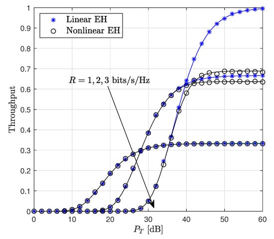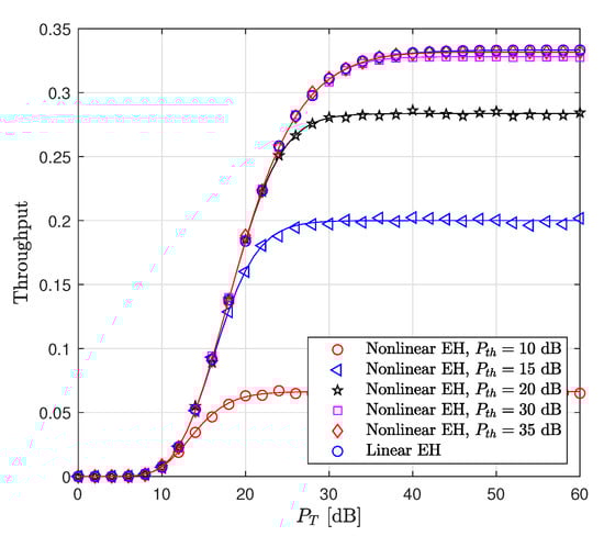 The throughput performance versus for different values of is shown in Figure 9. It is seen from Figure 9 that, by increasing from 10 dB to 35 dB, the throughput increases and reaches its maximum value for dB, which is approximately equivalent to the linear EH model throughput performance. In other words, a high level of threshold power in the non-linear EH model provides the same results as in the linear EH model since the amount of harvested power for both EH models is equal.